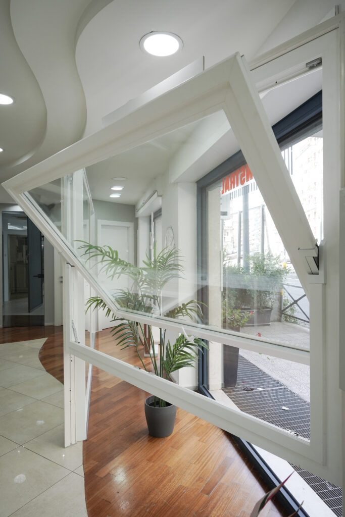- Tecnico: soluzione ideale per finestre di grandi dimensioni, consente un’ottima ventilazione controllata e garantisce prestazioni isolanti di alto livello, elimina ogni montante verticale ad interrompere “l’effetto cartolina” e non procura l’ingombro dell’anta aperta a battente all’interno della stanza. Infatti l’anta ruota orizzontalmente sul proprio asse per 180°, rendendo l’apertura pratica e sicura, in tal modo risulta estremamente facile il vantaggio del vetro esterno.