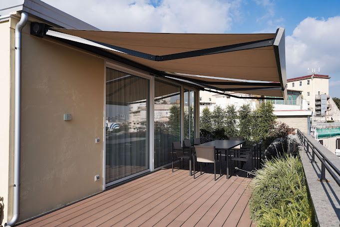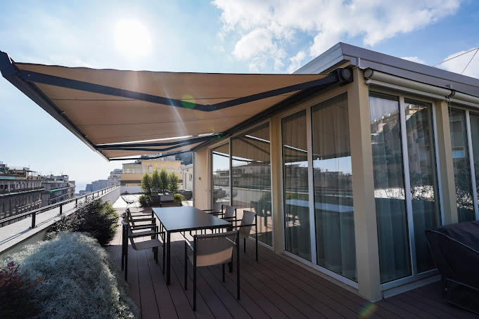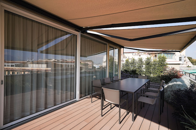 Un’ulteriore richiesta del cliente era la protezione dal sole, sia all’interno che all’esterno: per questo sono state scelte tende da sole motorizzate Gibus modello Nodo, eleganti e performanti.