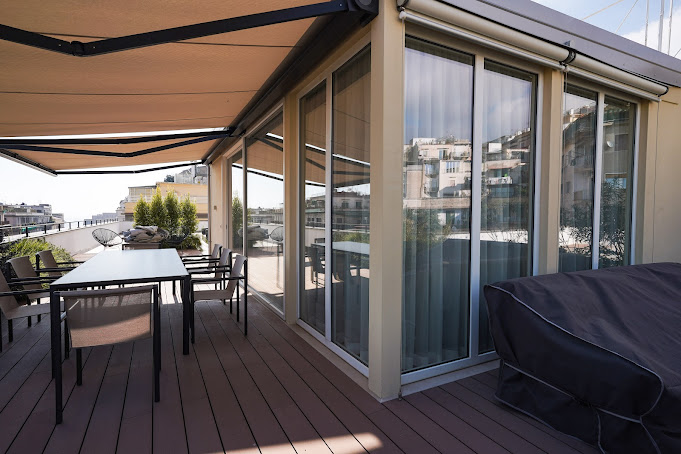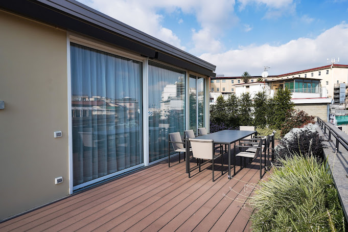 Per completare il progetto e rendere il terrazzo ancora più accogliente, è stata realizzata una pavimentazione esterna Déco con listoni in parquet composito, creando un ambiente raffinato, caldo e perfettamente vivibile durante tutto l’anno.