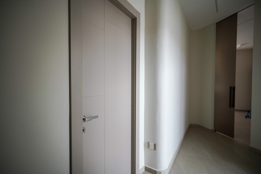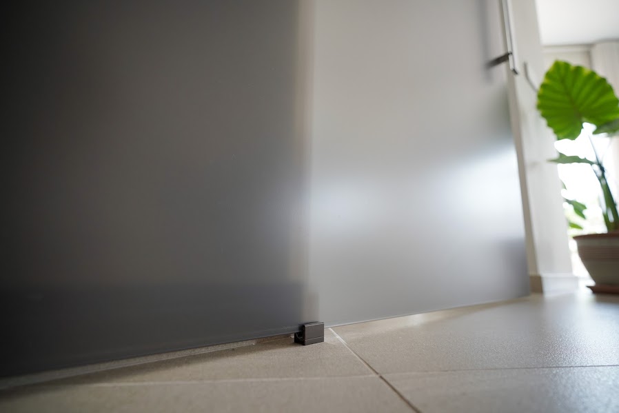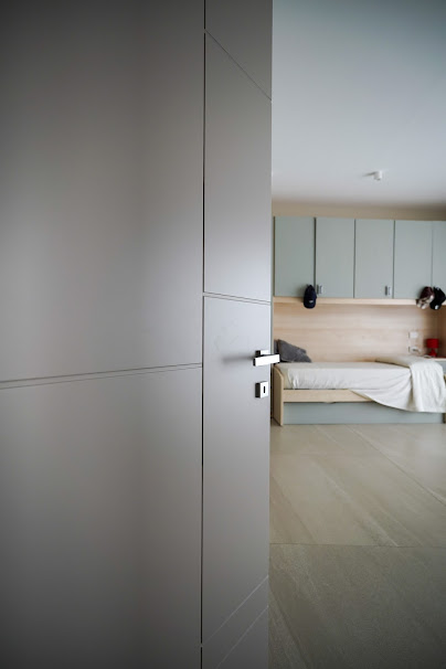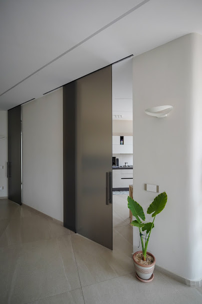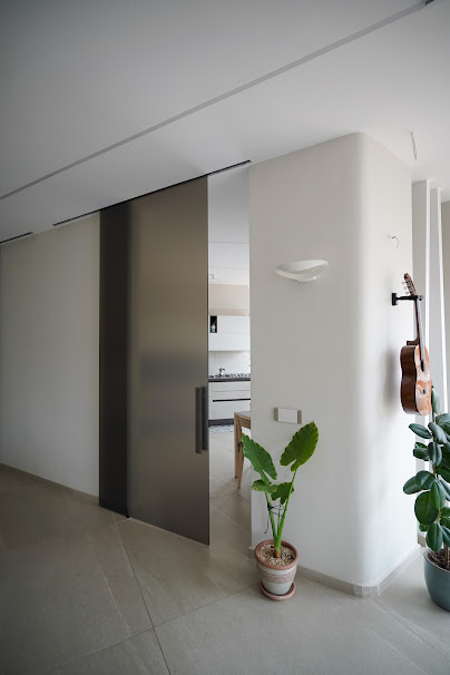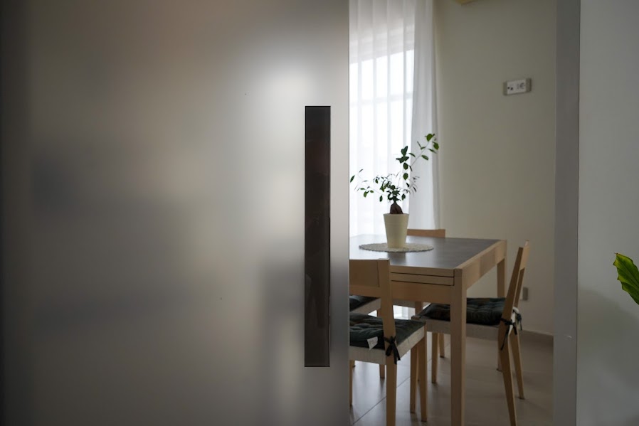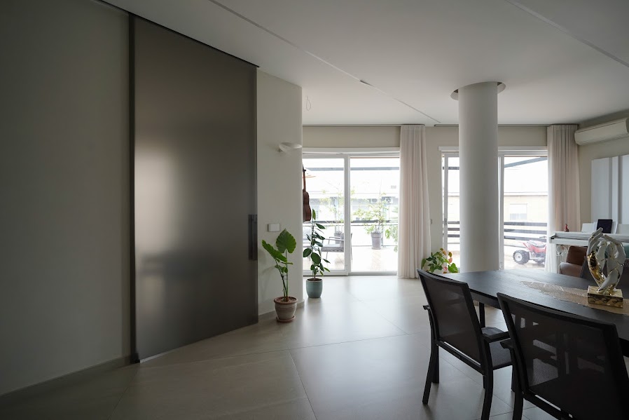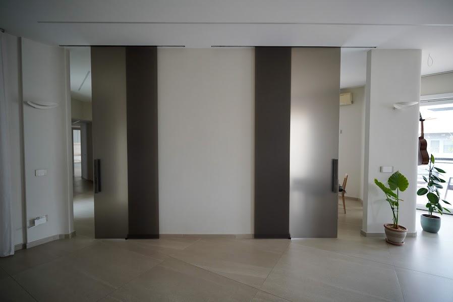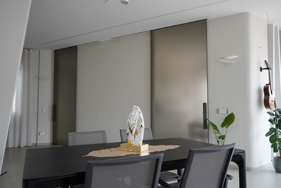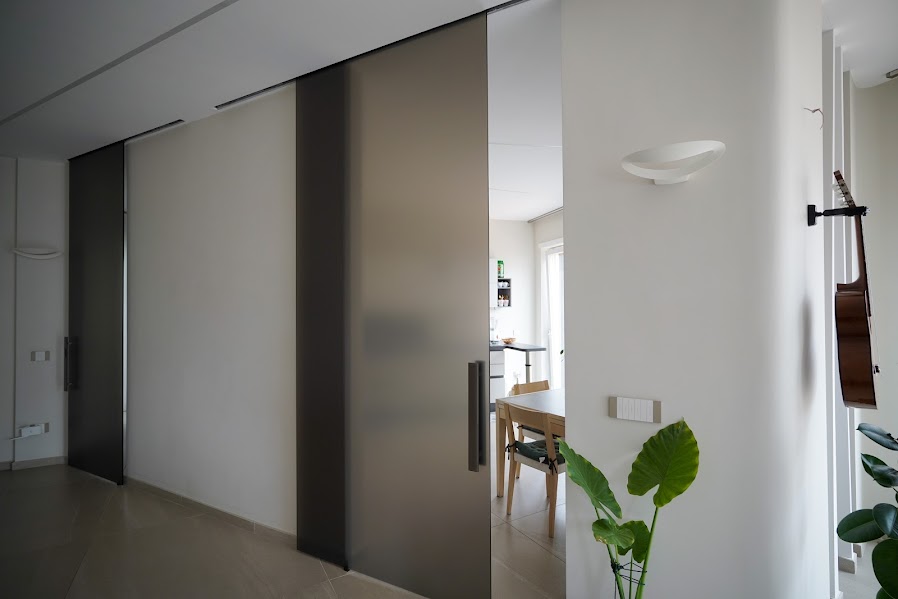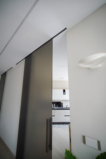 All’interno, per separare gli ambienti, sono state installate eleganti vetrate Henry Glass con vetri color mocha, binari incassati nella controsoffittatura ed a terra nessun binario di intralcio al passaggio, che si integrano perfettamente per stile e tonalità con le porte Pivato scelte dal cliente, in color tortora e caratterizzate da un disegno con incisioni. A completare il progetto, le vetrate sono state arricchite da un maniglione in cristallo sempre con finitura moka, dettaglio che ne esalta l’eleganza.