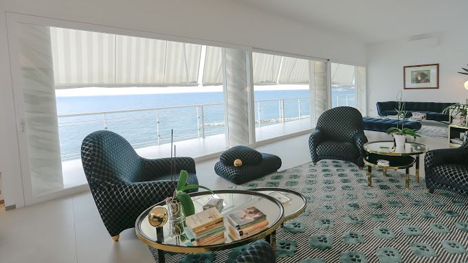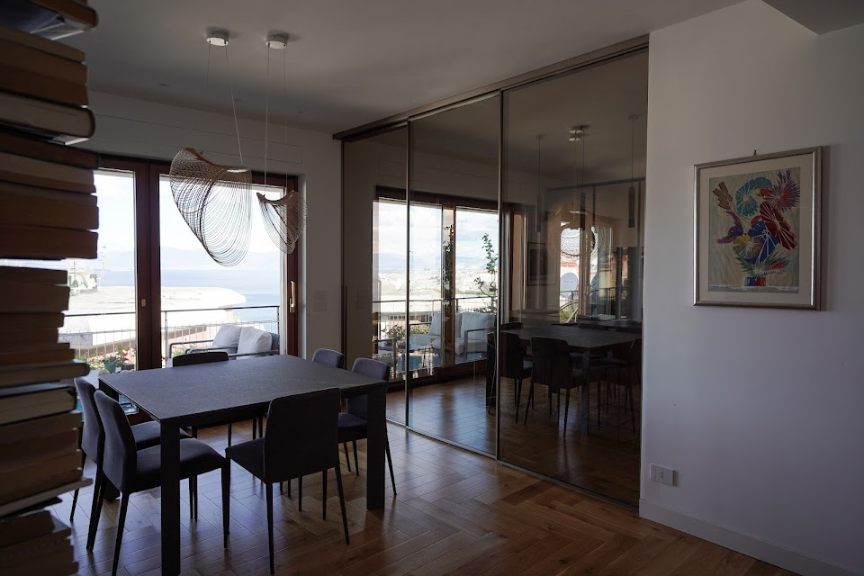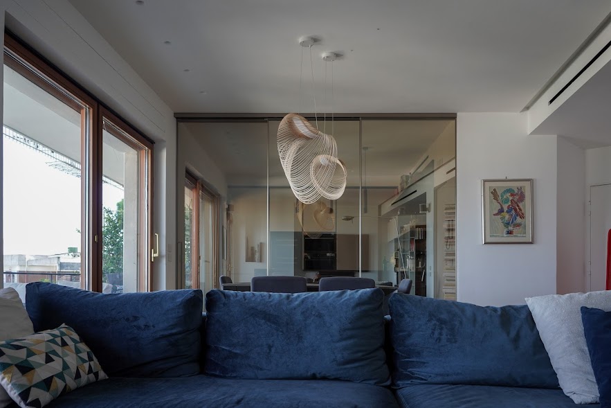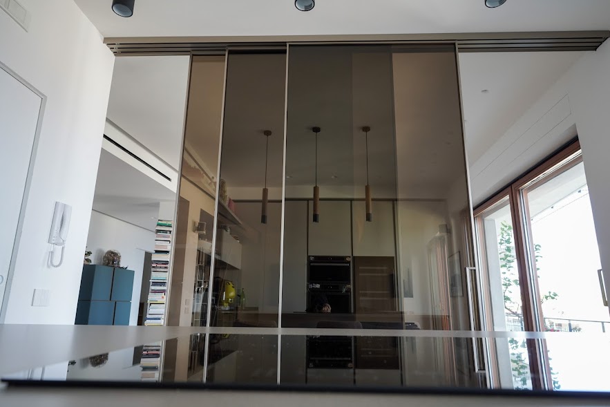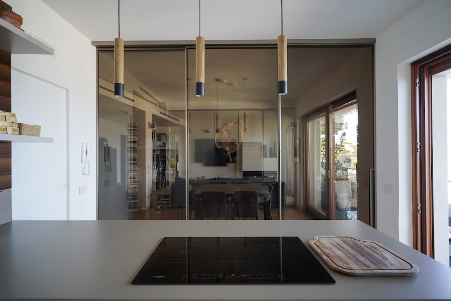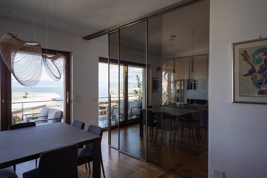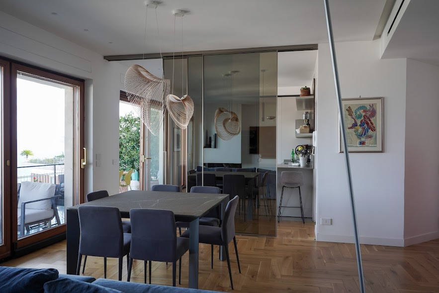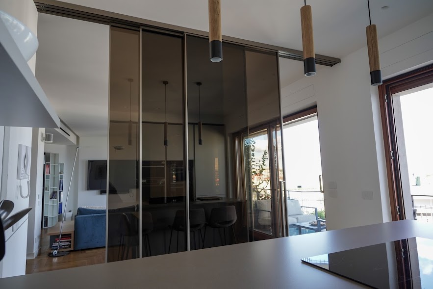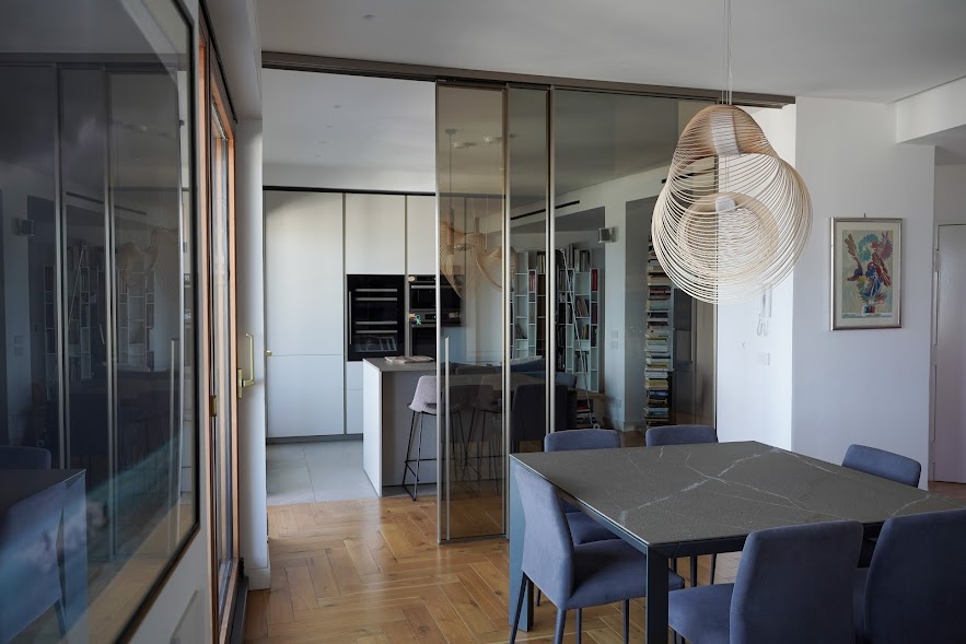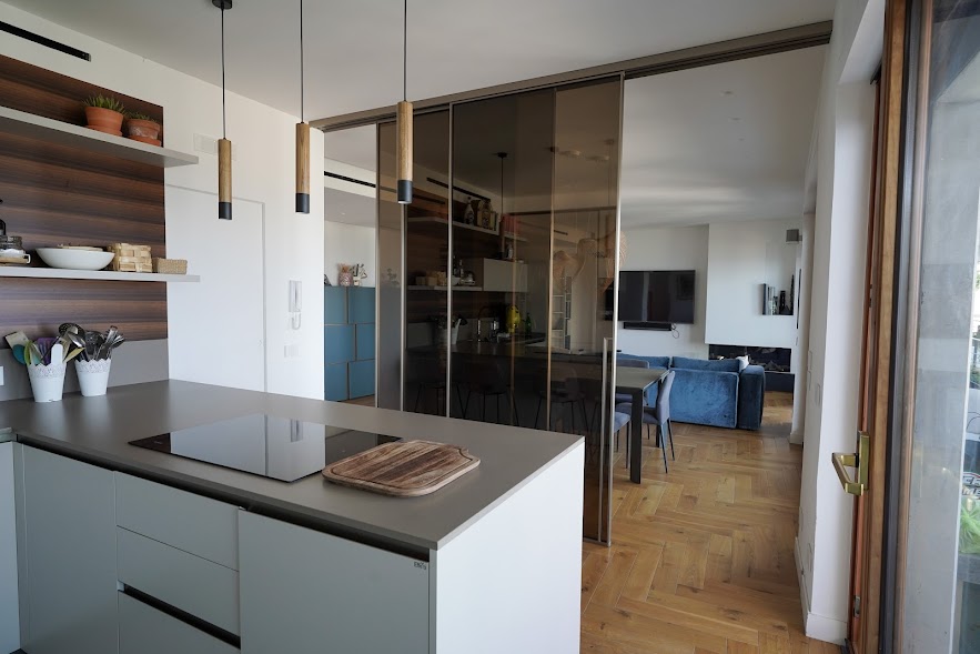 In questo progetto la proprietaria dell’immobile, a sua volta architetto, aveva l’esigenza di separare il soggiorno dalla cucina senza creare barriere in muratura, mantenendo la possibilità di vivere uno spazio unico e fluido, oppure – quando necessario – suddividere gli ambienti attraverso una soluzione leggera e trasparente, capace di preservare la visuale panoramica da entrambe le stanze.