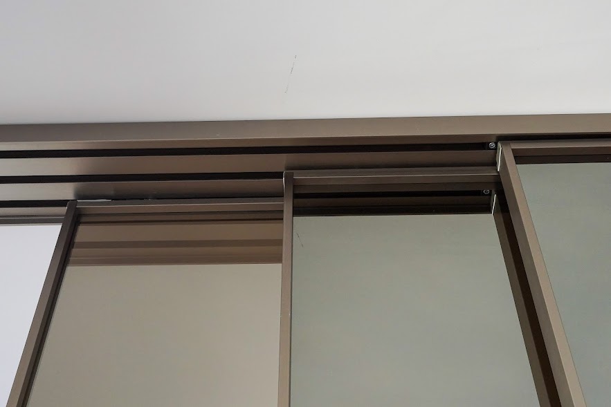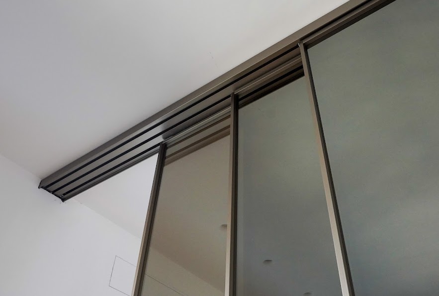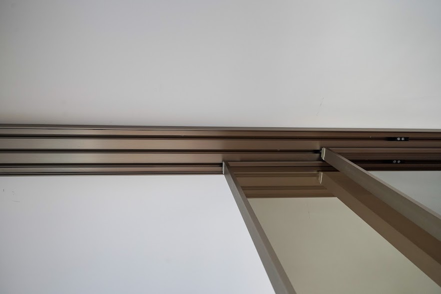 Come binario è stata utilizzata una trirotaia a soffitto, con due ante scorrevoli a trascinamento sull’anta fissa, soluzione che ha consentito di chiudere una parete di circa 3 metri e mezzo di larghezza per quasi 3 metri di altezza senza ricorrere alla muratura.