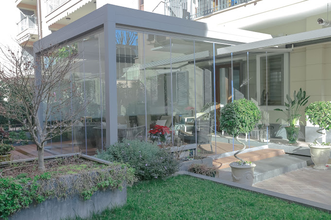 Per ottenere questo risultato sono state installate vetrate scorrevoli Henry Glass, linea Manhattan, impreziosite da un maniglione modello Avenue, il tutto in una raffinata finitura titanio anodizzato. I vetri stratificati bronzo riflettenti e trasparenti permettono un suggestivo gioco di luci: a seconda delle condizioni luminose, diventano specchiati o completamente trasparenti, creando un effetto scenico di grande eleganza.