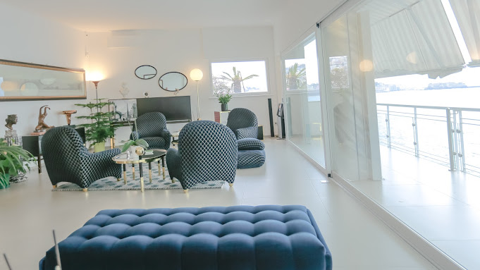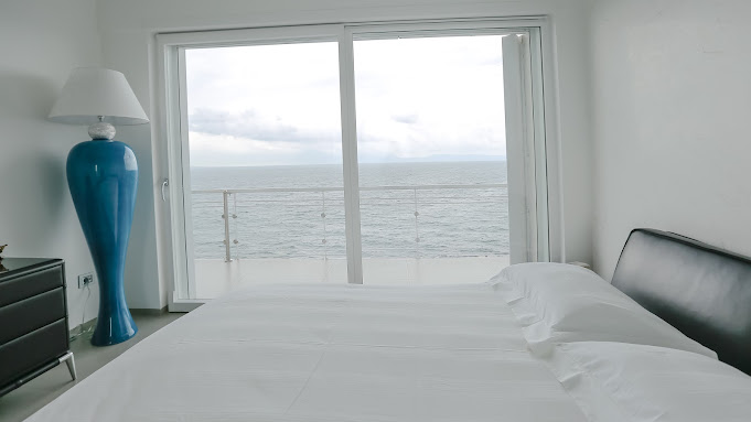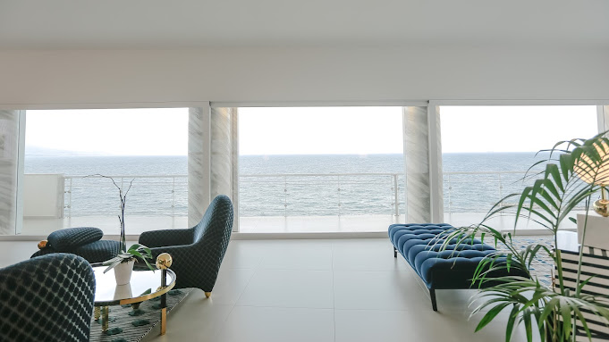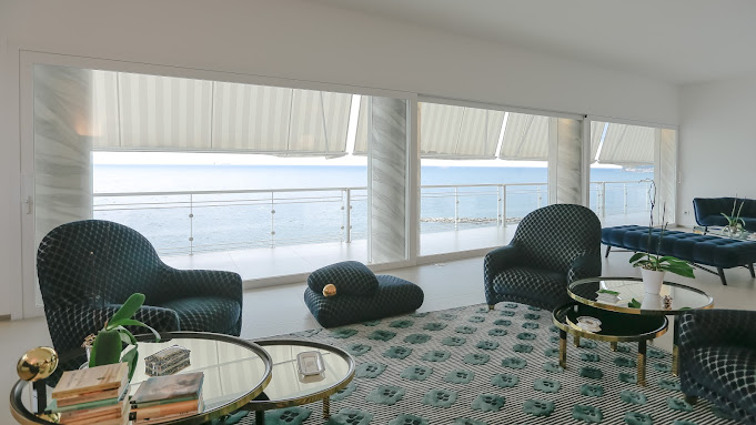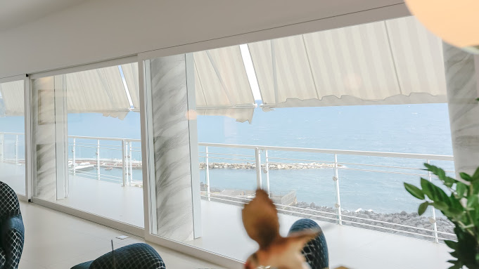 Sul lato mare, l’esigenza era avere grandi aperture vetrate a tutta vista. Abbiamo realizzato scorrevoli alzanti Schüco in alluminio a taglio termico, con ante superiori ai 5 metri di larghezza, affiancate tra loro per ottenere un effetto visivo spettacolare e senza interruzioni. Lo stesso concetto è stato applicato alle camere da letto, dove gli infissi scorrevoli permettono di ammirare, direttamente dal letto, il profilo di Capri e della penisola sorrentina. Per garantire comfort e protezione dal sole, esternamente sono state installate tende Gibus, eleganti e funzionali.