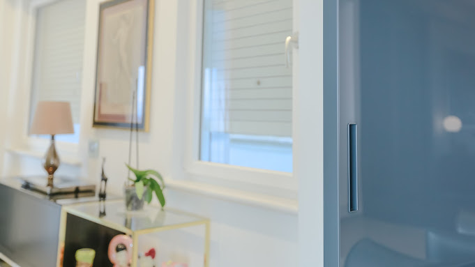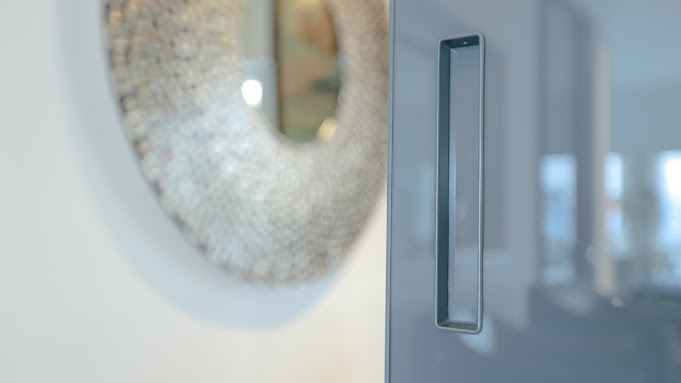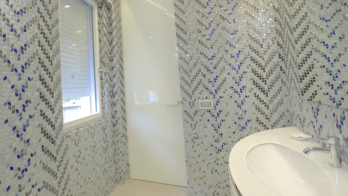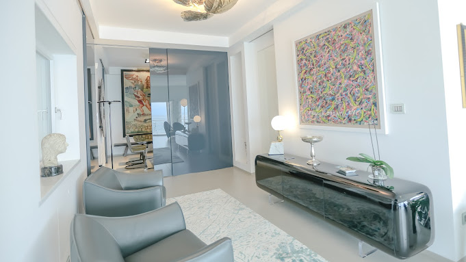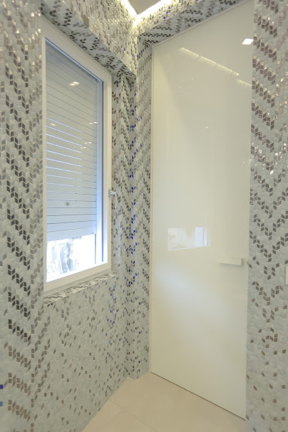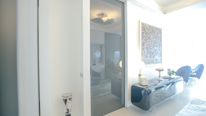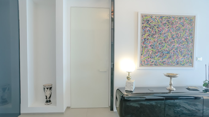 All’interno, il cliente – collezionista d’arte – desiderava un ambiente capace di far convivere le sue opere, anche antiche e preziose, con elementi dal design fortemente contemporaneo. Abbiamo quindi fornito porte a filo muro senza cornici, porte in vetro laccato e grandi scorrevoli in vetro laccato, utilizzati per separare zona giorno e zona notte, lo studio dal soggiorno e gli altri ambienti della casa.