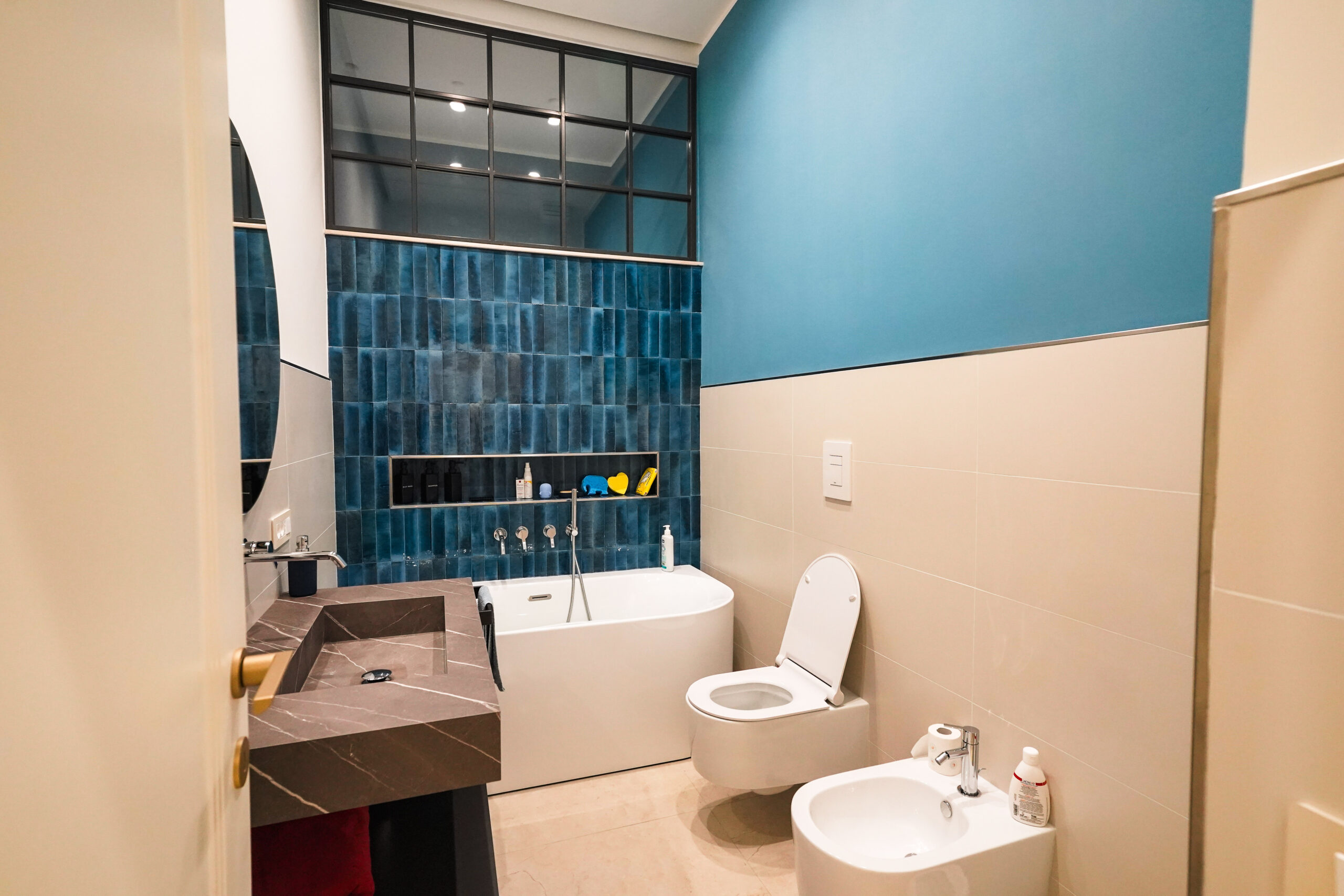 Lo stesso profilo è stato utilizzato anche per illuminare un bagno cieco, realizzando una porzione di parete vetrata tra il bagno e la zona giorno. In questo modo è stato possibile far entrare luce naturale richiamando, allo stesso tempo, il medesimo disegno a griglia presente nella vetrata principale.