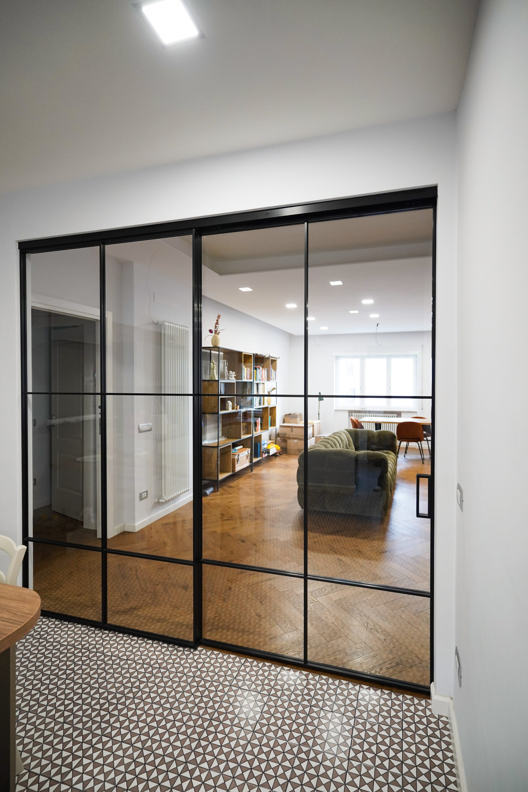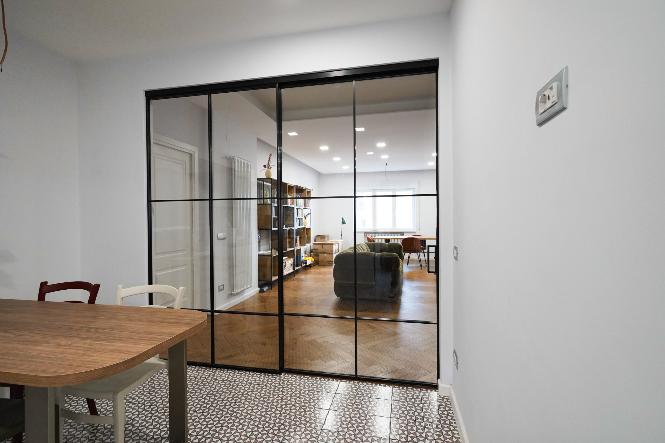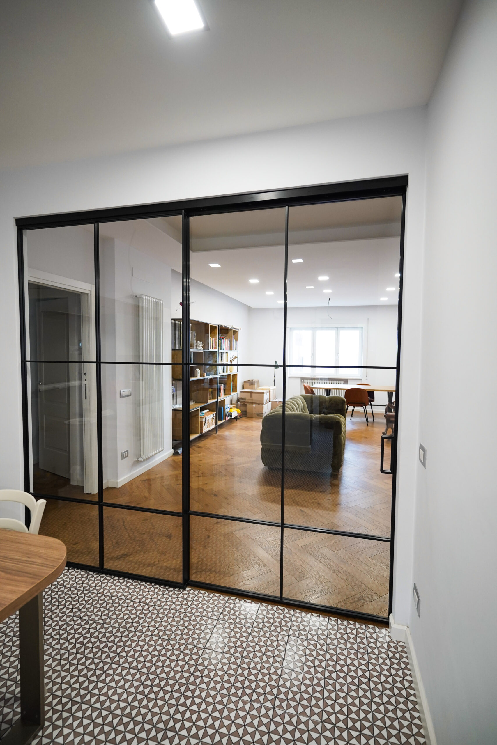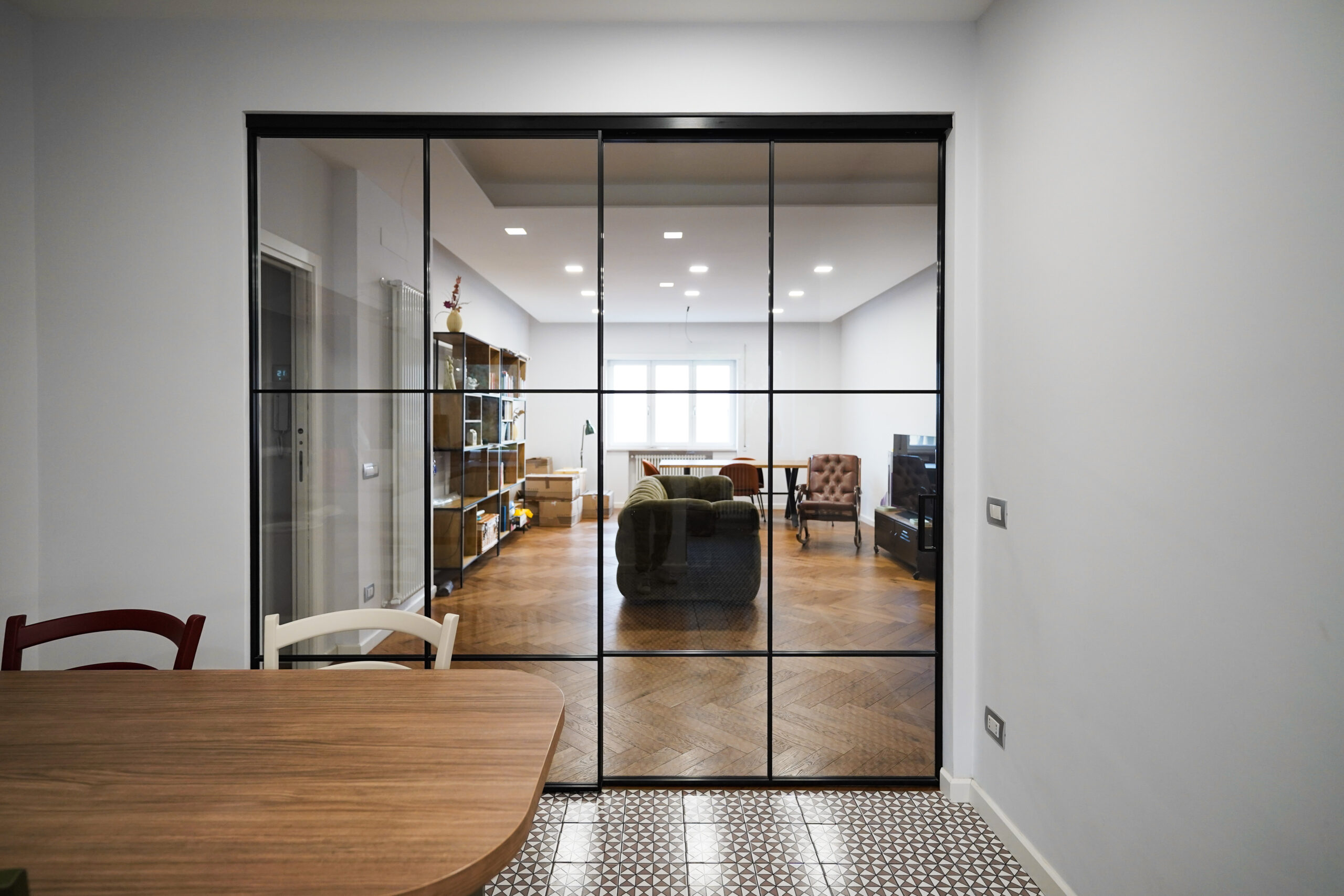 In questo lavoro è stato utilizzato lo stesso profilo Henry Glass per tutte le vetrate presenti nell’appartamento, garantendo continuità estetica e coerenza stilistica. In cucina, come divisorio tra soggiorno e cucina, è stata installata una vetrata scorrevole Henry Glass modello Manhattan Grid con vetro trasparente, una soluzione che permette di separare i due ambienti mantenendo però una totale continuità visiva.